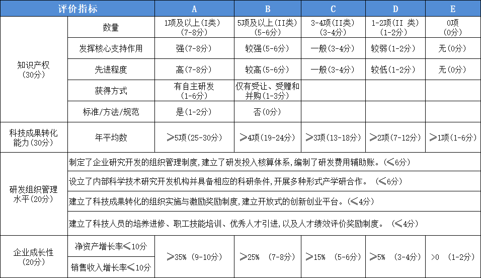 次要从学问产权、科技术力、研究开辟组织办理程度、企业成长性等四项目标进行评价。各级目标均由评审专家打分,满分为100分,分析得分达到70分以上(不含70分)为合适认定要求。四项目标分值布局详见下表?。